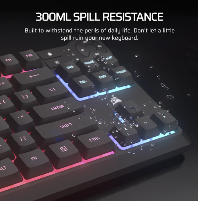 Kompakt, TKL (tenkeyless) kialakítású, membrános gamer billentyűzet, színes RGB háttérvilágítással és dedikált médialezérlőkkel. Spill resistance: akár 300 ml folyadék elleni védelem. 12-key rollover: anti-ghosting funkció, akár 12 egyidejű billentyű lenyomást is érzékel. iCUE kompatibilitás: teljes vezérlés és RGB beállítások CORSAIR szoftverből. Csatlakozás: USB 2.0 Type-A, vezetékes