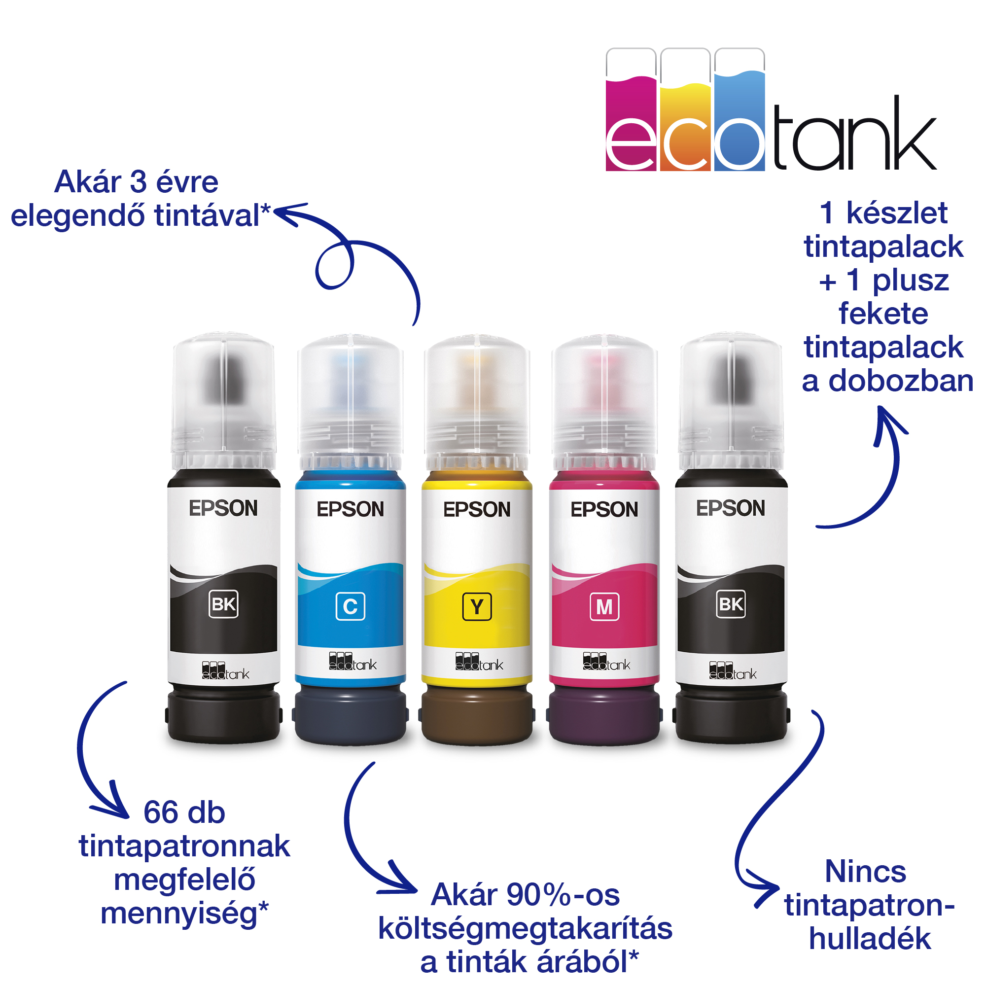 5760×1440 dpi felbontás, 4 szín (fekete, cián, bíbor, sárga). Nyomtatási sebesség ISO/IEC 24734: 10 lap/perc mono, 5 lap/perc színes, 69 mp/10×15 cm fotó; normál papíron 33 lap/perc mono, 15 lap/perc színes, 27 mp fotó (Epson Premium Glossy). Multifunkció: nyomtatás, szkennelés, másolás. Szkenner: CIS típus, optikai felbontás 1200×2400 dpi, sebesség 11 s (mono), 28 s (színes). Papírkezelés: 1 tálca, 100 lap bemenet, 30 lap kimenet, papírsúly 64–300 g/m², formátumok A4, A5, A6, B5, 10×15, 13×18, DL, C6, No.10, Letter, Legal, kézi duplex, szegély nélküli nyomtatás 10×15 cm-ig. Energiafogyasztás: 12 W (másolás), 4.5 W (kész), 0.7 W (alvó), 0.2 W (kikapcsolt) Méret: 375×347×179 mm, súly 4.1 kg. Csatlakozás: USB, Wi-Fi, Wi-Fi Direct. Mobilnyomtatás: Epson Connect (iPrint, Email Print, Remote Print Driver), Apple AirPrint. Szín: fehér. LCD kijelző: 3.7 cm színes. Garancia: 12 hónap vagy 30 000 oldal. Tintakapacitás: 8100 oldal (fekete), 6500 oldal (színes).