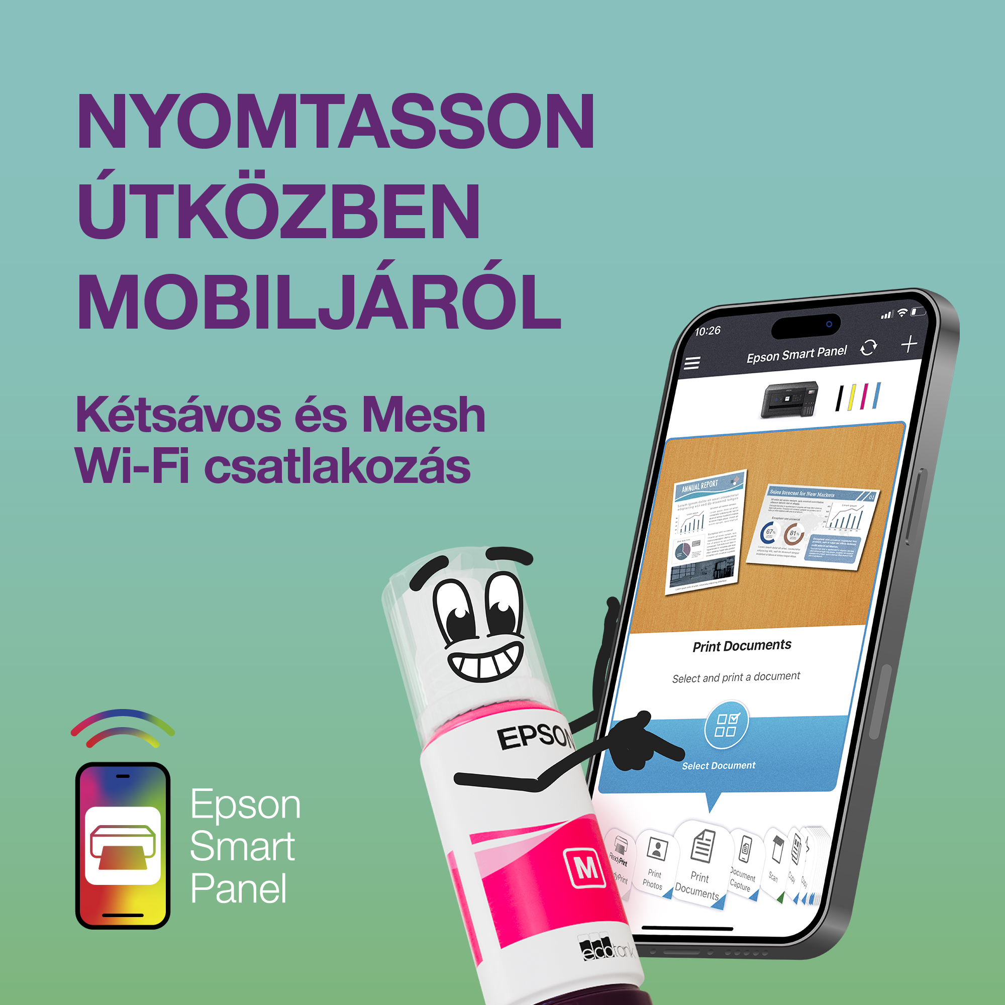 - A megbízható vezeték nélküli kapcsolatnak csatlakoztathatóságnak köszönhetően bárhonnan nyomtathat Használja az Epson Smart Panel alkalmazást a mobiljáról történő beállításhoz, felügyelethez, nyomtatáshoz és még sok máshoz*